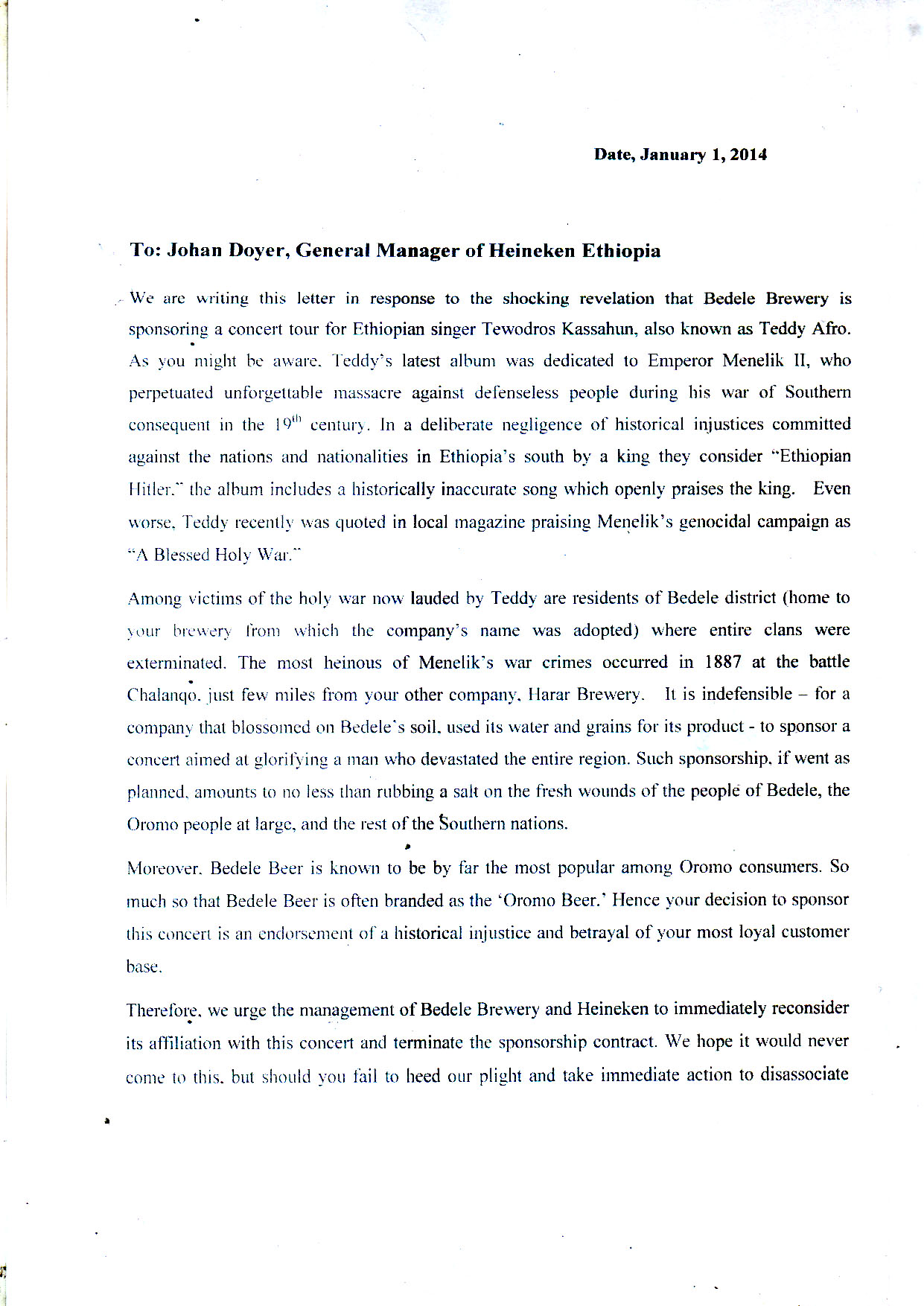 Egaa dabni yeroo dheeraaf gaggeeffamaa ture kun akkanaan otoo jiru Oromoota biratti waan dagatame fi dhokate fakkeessuun namoonni hawwii bulchiinsa namticha kanaa qabanii figochaa isaa kanaaf deeggarsa fi gammachuu qaban har’a kabaja ykn faarfannaa waggaa dhibbaffaa mootii Miniliik jechuun Oromoo fi Oromiyaa irra naanna’uun maqaa konsertiin ispoonsarummaa waarshaa biiraa baddalleen wal ta’uun faarfachuuf qophii xumuranii akka jiran kan eenyu jalaa iyyuu hin dhokannee fi ifatti hubatamaa jiru dha. Kun immoo uummata miidhame isaa kana seenaaf jedhee qabatee obsaan taa’e kana madaa isaa yeroo irratti gammachuun faarfatan callisee obsaan dhaggeeffata jedhanii yaaduun ykn eeguun gara laafina irra tufii ta’uu hunda keenya jalaa waan dhokatu hin fakkaatu. Tarii gochaan maal dhibdiin ykn maaltu dhufaan gaggeeffamuuf jiru kun mootummaa ykn sirni biyya bulchaa jiru addattu mootummaan naannoo Oromiyaa akkamiin irraa callisee ilaala? kan jedhu gaaffii uummata Oromoo ta’uus, gochaan kun uummata Oromoo saboota kaan waliin kabajaa fi obsaan jiraachaa jiru seenaa badaa kana myeroo irratti faarfamu of irraa ittisuun waan dirquuf kallattii hin barbaachisne qabachuun dirqama ta’uun hundi keenya hubachuu feesisa.