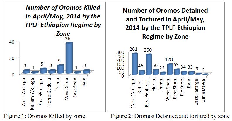 In this report we present a list of 61 Oromos that are killed and 903 others that are detained and beaten (or beaten and then detained) during and after the Oromo students protest which begun in April 2014 and which we managed to collect and compile. The information we obtain so far indicates those detained are still in jail and still under torture. Figure 1 below shows the number of Oromos killed from different zones of Oromia included in this report. Figure 2 shows the number of Oromos detained and reportedly facing torture. It has to be noted that this number is only a small fraction of the widespread killings and arrest of Oromos carried out by the regime in Oromia regional state since April 2014 to date. Our Data Collection Team is operating in the region under tight and risky security conditions not to consider lack of logistic, financial and man power to carry the data collection over the vast region of Oromia.