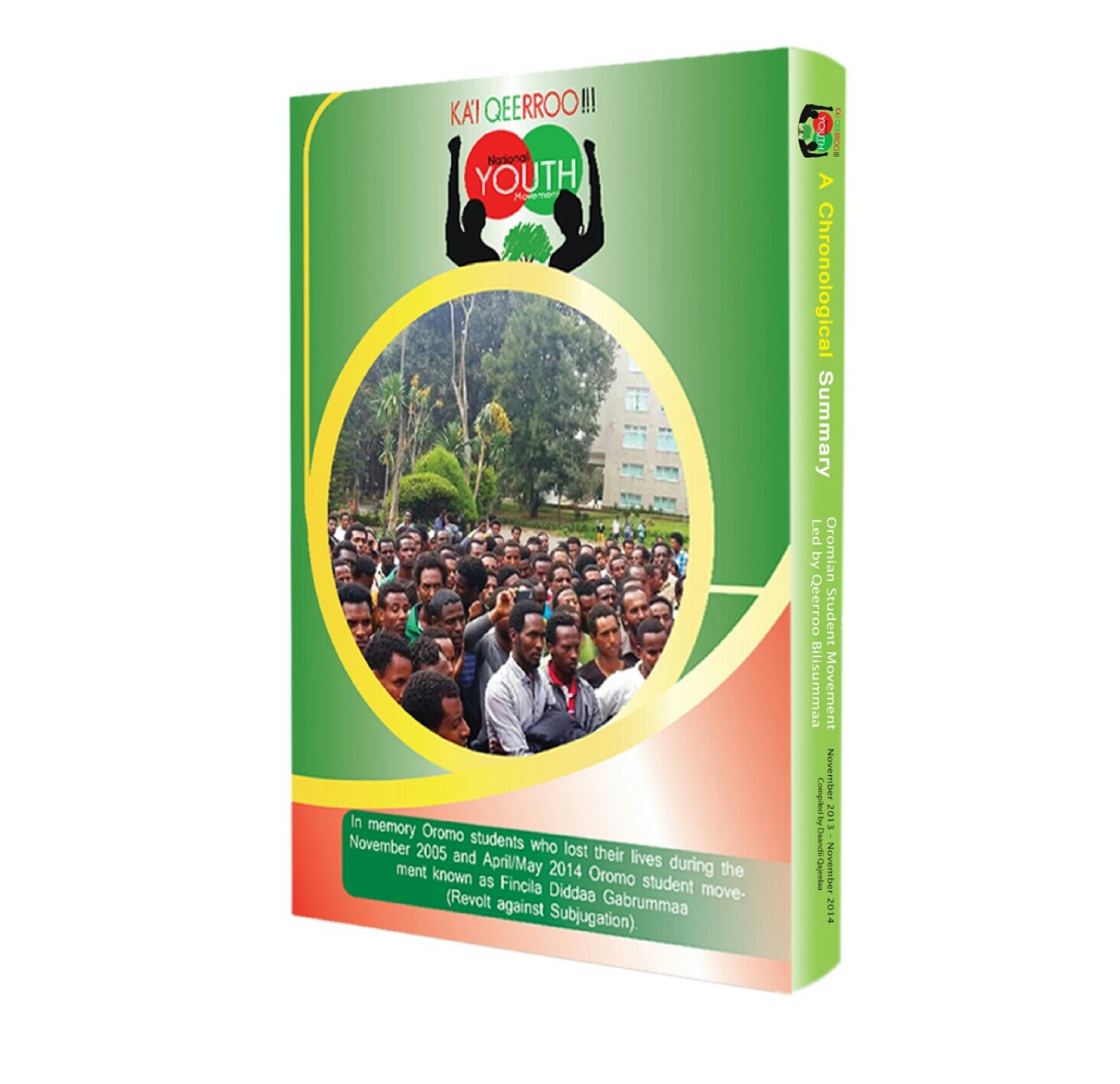 Qeerroo Bilisummaa is pleased to announce that a new book summarizing the 2013-2014 activities of Qeerroo and the historical Oromo student movement of April/May 2014 is published and is distributed around the world. The book, authored by an Oromo scholar Daandii Qajeelaa, entitled “A Chronological Summary of Oromian Student Movement Led by Qeerroo Bilisummaa”, effectively documents the Oromo student movement and the brutal response of the Ethiopian regime in a chronological order, by date and place of incident, and is supported by photographs and links to the main source of the information on each incident. It is the first of its kind to document the struggle of the Oromo students known as Fincila Diddaa Gabrummaa (Revolt Against subjugation) in the English Language. All Oromos, who claim to be embodied with Oromo nationalism (Oromummaa), need to purchase this book and have it on their shelves for historical reference and/or pass it to their children. All non-Oromos and friends of the Oromo who are interested to know the magnitude and the essence of the historical 2014 Oromo student movement need to read this book. The book can be found by inquiring the Oromo community of your area.