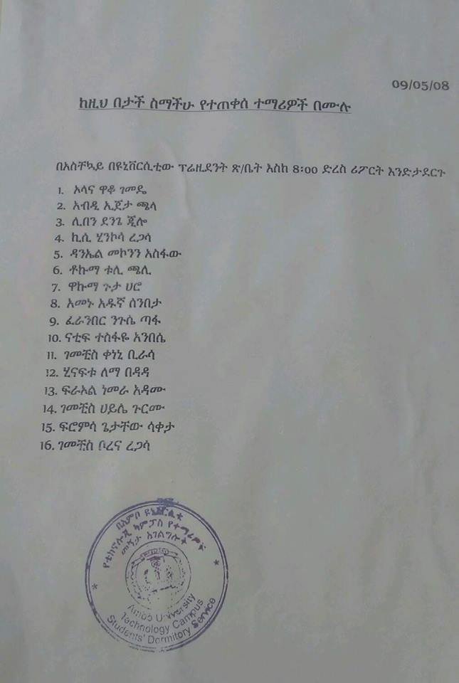 Gaafa Amajjii 19,2016 Bulchiinsii Yuunibarsiitii Amboo Mirga Barattoota Oromoo cabsuun Barattoota Oromoo Dootsisuu fi Barnoota Irraa arii’uuf hidhatti galchee dararuuf qajeelfama Mootummaa Wayyaanee Rawwachiisuu qofaaf jedhee Barattoota Oromoo 16 hatattamaan barbaada akka jiruu Beeksiisa Amajjii 19,2016 baaseen Beeksisee jira. Barattoota Oromoo kana irratti rakkoon tokkoo bakka fedheetti iyyuu irra ga’ee yoo argamee Itti Gaafatamaan Mootummaa EPRDF/TPLF/OPDO fi bulchiinsaa yuunibarsiitii Amboo ta’uu Sabboontootni fi uummatni Oromoo akeekkachiisan.