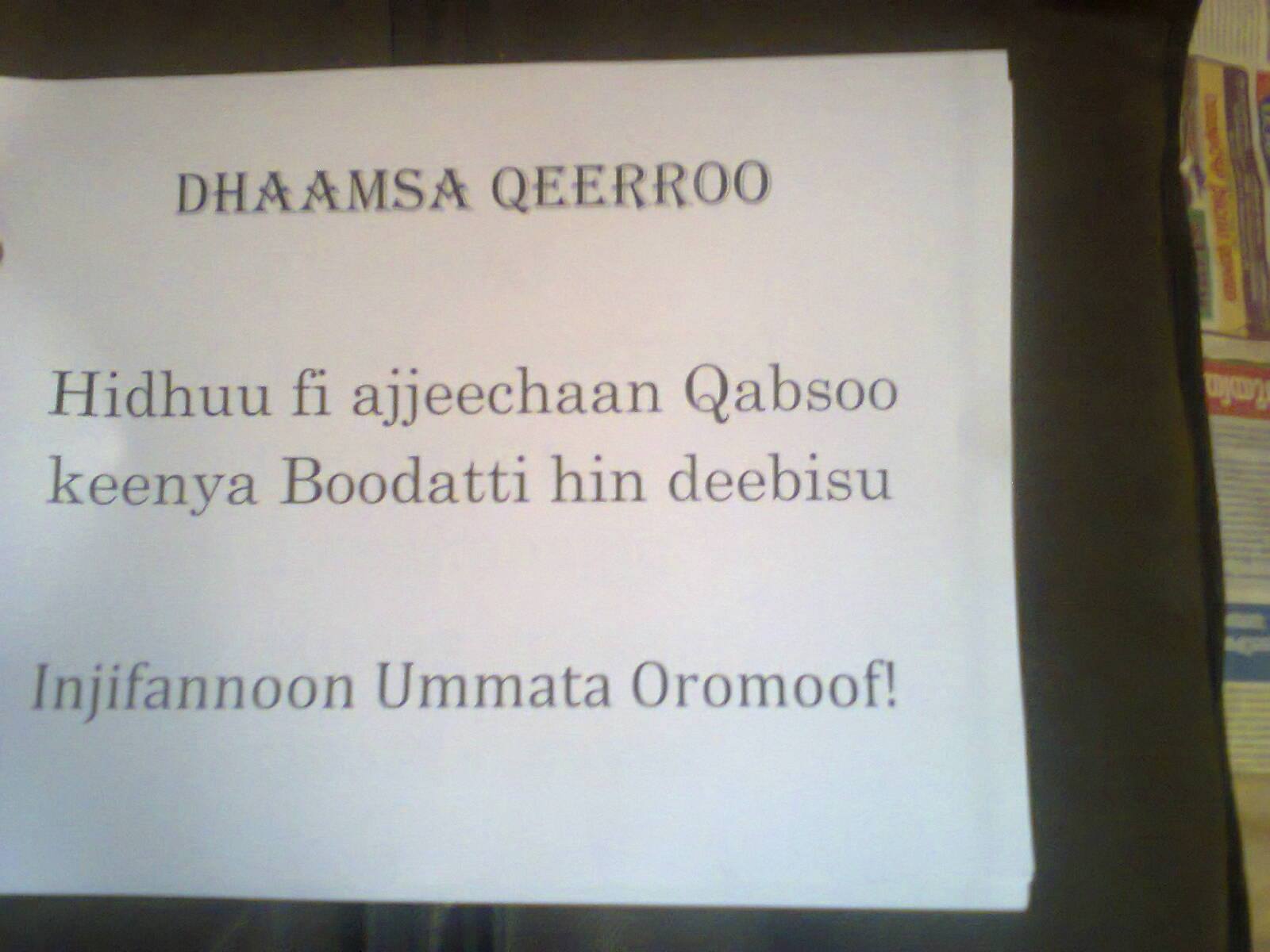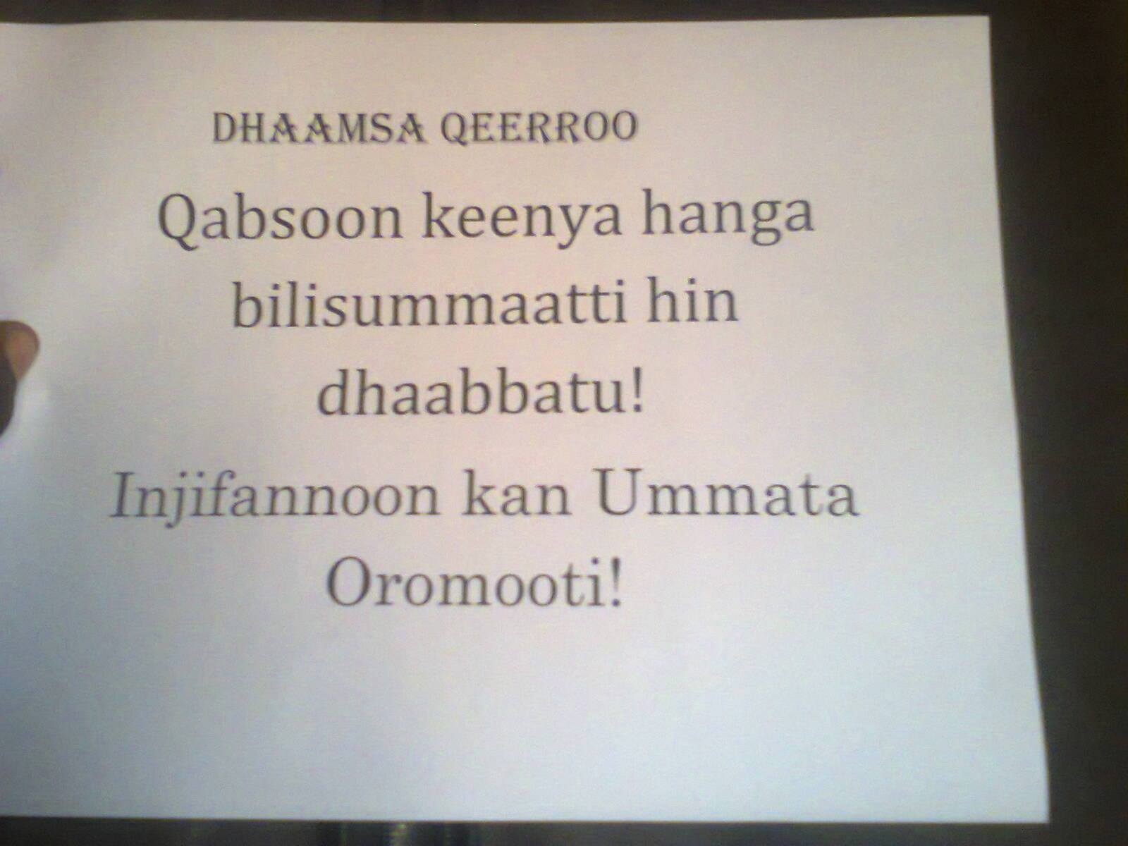 Guyyaa har’ as Bitootessa 22,2016 Godina Wallaggaa Lixaa anaa Jaarsoo keessattii Qeerroon magaalaa Jaarsoo waraqaa Qabsoo hangaa bilisummaattiu hin dhabaatu jedhuf….OPDON ummataa Oromoo bakka hin butuu …ummannii Keenya motummaa namaa nyaata wayyanneef gibiraa akkaa hin kafallee…fi hiidhaafi ajeechaan dubbattii nu hin deebisu jedhu.. gutummaa magaalaa Jaarsoof moraa manneen barnootaa akkasumas waajjiroota adda addaatti Qeerroon faccassuun jala deemtootaa wayyannee nasuu guddaa keessaa olchee jira..