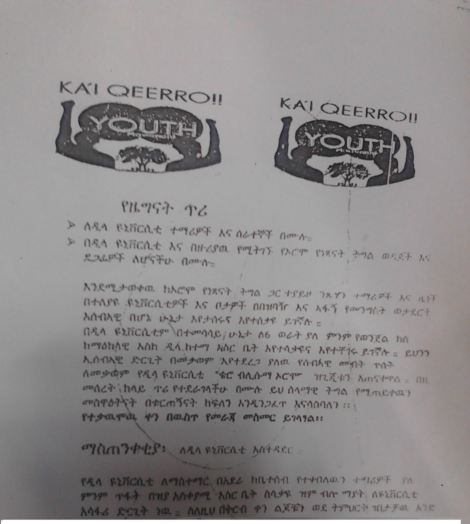 Qeeyroon Yuuniversitii Diillaa keessatti waraqaa warraaqsaa “WAAMICHA LAMMUMMAA” jedhu maxxansuun Qeeyroon gabaasee jira. kunis Waxabajii 18/2016 barreeffamni warraaqsaa bittimfame kun poolisii Wayyaanee boqonnaa dhorgudhaan naasuudhaan waraanni naannoo moorichaa akka qubatu taasifamee jira. Waraqaan kun erga maxxanfamee kaasee Yuuniversitiin keessaa fi alaan waraanaan marfamuudhaan barruuwwan Qeeyroon waamicha taasise kana bakka maxxanfamee waraanni funaanuunis meeshaa camadee barattota tiksuunis odessi Qeeyroo moorichaa nu gahe addeessee jira.