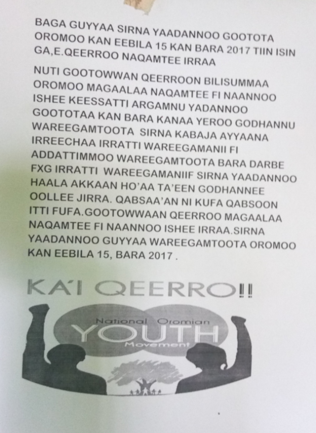 Ebla 16,2017/Sirni kabaja guyyaa Gootota Oromoo godina Wallagga bahaa magaalaa Naqamtee fi naannoo ishee keessatti akkasumas gootowwan Qeerroon Yuunivarsiitii Wallaggaa keessaa walitti dhufuun Eebili 15 haala akkaan ho’aa ta’een kabajamee ooluu Qeerroon leeqaa gabaase.